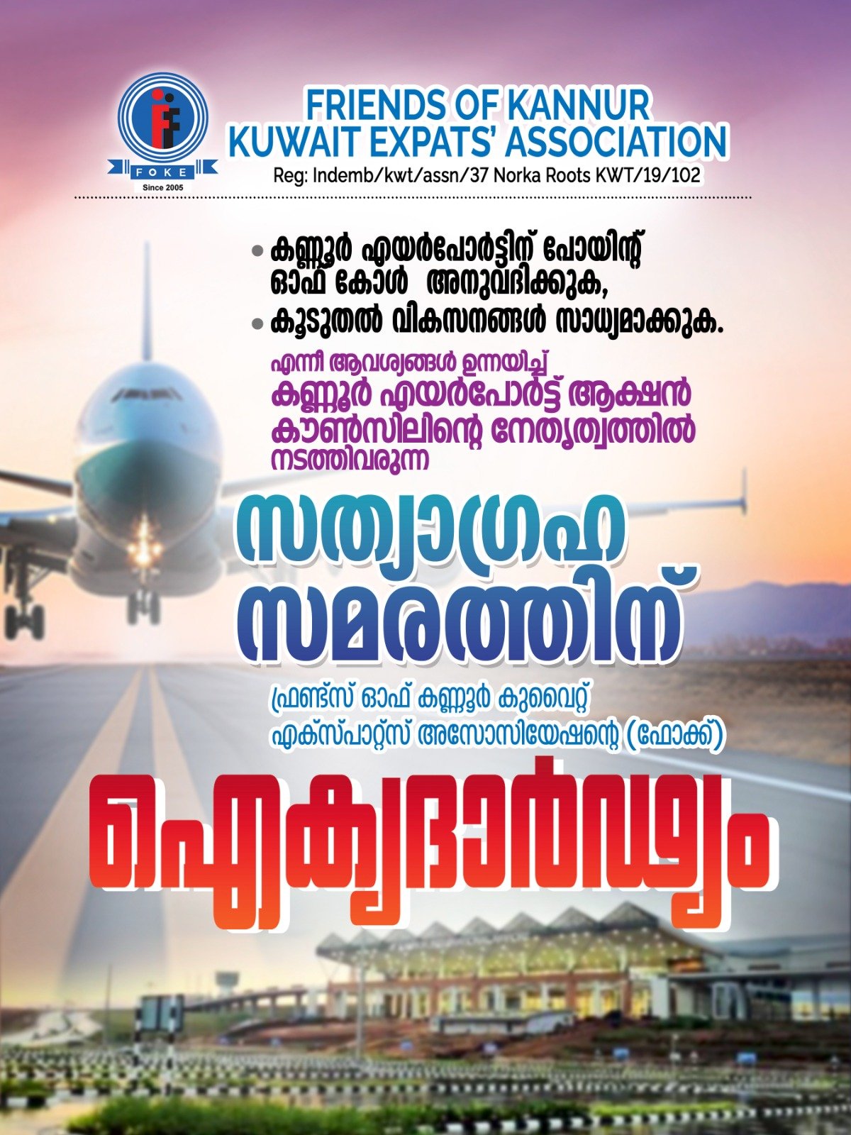 കുവൈത്ത് സിറ്റി: കണ്ണൂർ എയർപോർട്ടിന്റെ പോയിന്റ് ഓഫ് കോൾ അനുവദിക്കുക, കൂടുതൽ വികസനങ്ങൾ സാധ്യമാക്കുക എന്നീ ആവശ്യങ്ങൾ ഉന്നയിച്ച് കണ്ണൂർ എയർപോർട്ട് ആക്ഷൻ കൗൺസിലിന്റെ നേതൃത്വത്തിൽ നടത്തിവരുന്ന അനിശ്ചിത കാല സത്യാഗ്രഹ സമരത്തിന് ഫ്രണ്ട്സ് ഓഫ് കണ്ണൂർ കുവൈറ്റ് എക്സ്പ്പാട്സ് അസോസിയേഷൻ (ഫോക്ക്) ഐക്യദാർഢ്യം പ്രഖ്യാപിച്ചു. കണ്ണൂർ എയർപോർട്ട് തുടങ്ങി വർഷങ്ങൾ ആയെങ്കിലും, കണ്ണൂരിൽ നിന്നുള്ള പ്രവാസികൾക്കു നാട്ടിലേക്കുള്ള യാത്ര ഇപ്പോഴും നിരാശജനകമാണ്. എയർപോർട്ടിൻ്റെ വികസനം നാടിൻ്റെയും കൂടി വികസനമാണ്. അത് കൊണ്ട് തന്നെ അധികാരികൾ കണ്ണ് തുറക്കും വരെ നാട്ടിലും, മറുനാട്ടിലുമുള്ള മുഴുവൻ പ്രവാസി സമൂഹത്തോടൊപ്പം ഈ സമരത്തിൽ ചേർന്ന് നിൽക്കുമെന്ന് ഫോക്ക് ഭാരവാഹികൾ പത്രകുറിപ്പിലൂടെ അറിയിച്ചു.