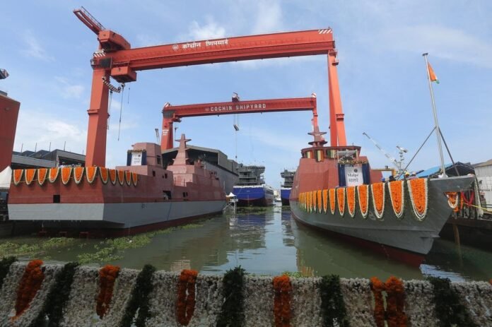 കൊച്ചി: നാവിക സേന പ്രതിരോധ ശക്തി വർധിപ്പിക്കുന്നതിന്റെ ഭാഗമായി നിർമിച്ച 2 അന്തർവാഹിനി പ്രതിരോധ കപ്പലുകൾ നീറ്റിലിറക്കി. ദക്ഷിണ നാവിക കമാൻഡ് ഫ്ലാഗ് ഓഫിസർ കമാൻഡിങ് ഇൻ ചീഫ് വൈസ് അഡ്മിറൽ വി. ശ്രീനിവാസിന്റെ ഭാര്യ വിജയ ശ്രീനിവാസ് കപ്പലുകൾ നീറ്റിലിറക്കുന്ന ചടങ്ങ് നിർവഹിച്ചു. നാവികസേനക്കുവേണ്ടി കൊച്ചി കപ്പൽശാല നിർമിക്കുന്ന ഇത്തരം എട്ടു കപ്പലുകളിൽ നാലാമത്തേതും അഞ്ചാമത്തേതുമാണ് ഇവ.