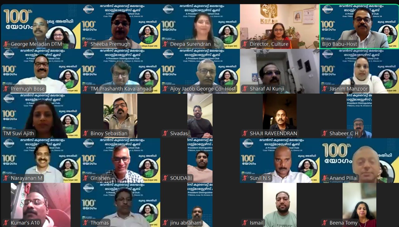 കുവൈത്ത് സിറ്റി: കുവൈത്തിലെ ഏക മലയാളം ടോസ്റ്റ് മാസ്റ്റേഴ്സ് ക്ലബ് ആയ ഭവൻസ് കുവൈറ്റ് മലയാളം ടോസ്റ്റു മാസ്റ്റേഴ്സ് ക്ലബ്ബിന്റെ നൂറാമതു യോഗം 2025 ജനുവരി നാലാം തീയതി ശനിയാഴ്ച വൈകുന്നേരം 4 മണിയ്ക്ക് കൂടുകയുണ്ടായി. ഓൺലൈൻ ആയി സംഘടിപ്പിച്ച യോഗത്തിലെ മുഖ്യ ആകർഷണം, വിഴിഞ്ഞം പോർട്ട് എം.ഡിയും, കേരളം സർക്കാരിന്റെ സാംസ്കാരികവകുപ്പ് അദ്ധ്യക്ഷയും, പ്രശസ്ത പ്രഭാഷകയുമായ ഡോക്ടർ ദിവ്യ എസ് അയ്യർ ഐ എ എസ് ആയിരുന്നു. ക്ലബിന്റെ മുൻ അദ്ധ്യക്ഷ ആയിരുന്ന ഷീബാ പ്രെമുഖ് മുഖ്യാതിഥിയെ സദസ്സിന് പരിചയപ്പെടുത്തി. ടോസ്റ്റ് മാസ്റ്റേഴ്സ് അംഗങ്ങളായവരും അല്ലാത്തവരുമായ ഏകദേശം 100-ഓളം പേർ പങ്കെടുത്ത യോഗത്തിൽ മുഖ്യാതിഥി ആയ ഡോ. ദിവ്യ, “മലയാളഭാഷയും പുതിയ തലമുറയും” എന്ന വിഷയത്തെ അധികരിച്ച് നടത്തിയ പ്രഭാഷണം മലയാള ഭാഷാസ്നേഹികൾക്കേവർക്കും ഒരു പോലെ ആസ്വാദ്യകരമായിരുന്നു. ജൈവികവും കാലാനുസൃതവുമായി വളർന്നുകൊണ്ടിരിക്കുന്ന മലയാളഭാഷ കൂടുതൽ പ്രചാരണവും വ്യാപ്തിയും അർഹിക്കുന്നു എന്ന് തിരിച്ചറിഞ്ഞു ചുവട് വയ്ക്കുവാൻ, കുഞ്ഞുണ്ണി മാഷിനെയും ഒരാഴ്ചയ്ക്ക് മുൻപ് കഥാവശേഷനായ എം.ടി. വാസുദേവൻനായർ എന്നിവരെയും ഭാഷാ ഉപയോഗത്തിലെ പുതു പ്രവണതകളെയും ഉദാഹരിച്ചുകൊണ്ട് ഡോ. ദിവ്യ വിവരിക്കുകയുണ്ടായി. ഭാഷയുടെ ശോഷണത്തെ കുറിച്ച ആശങ്കപ്പെടുന്ന നമുക്ക് ചെയ്യേണ്ടതായ ലഘു ഗൃഹപാഠം ഉൾപ്പെടെ ഉള്ള കാര്യങ്ങളെ ഓർമ്മപ്പെടുത്തിക്കൊണ്ട് മുന്നോട്ട് പോകുവാൻ ഏത് മലയാളിയെയും ഉത്ബോധിപ്പിക്കുകയും ചെയ്യുന്ന ഒരു മധുരകരമായ വേളയായി മുഖ്യാതിഥിയായ ഡോ. ദിവ്യയുടെ പ്രഭാഷണം. പ്രഭാഷണത്തെ തുടർന്ന് ക്രമീകരിച്ചിരുന്ന ലഘു-ചോദ്യോത്തരവേളയിൽ അതിഥികളും ക്ലബ്ബ് അംഗങ്ങളും മുഖ്യാതിഥിയുമായി തങ്ങളുടെ ചോദ്യങ്ങളുമായി തുറന്ന് സംവദിക്കുവാനുള്ള അവിസ്മരണീയമായ ഒരു അവസരവുമായി മാറി. തുടർന്ന് ക്ലബ്ബിന്റെ വിദ്യാഭ്യാസ ഉപാദ്ധ്യക്ഷൻ ആയ ശ്രീ. പ്രശാന്ത് കവളങ്ങാട് പിന്നിട്ട നാൾവഴികളെ കുറിച്ച് ഹൃസ്വമായി അവതരിപ്പിക്കുകയുണ്ടായി. അംഗങ്ങളുടെ കുടുംബാംഗങ്ങളായ വചൻ പ്രമുഖ്, കാർത്തിക് നാരായണൻ, മല്ലികാലക്ഷ്മി എന്നിവർ അവതരിപ്പിച്ച കലാപരിപാടികൾ ഏവരും ഒരു പോലെ ആസ്വദിച്ചു. ശ്രീമതി സുവി അജിത് അവതാരക ആയിരുന്ന യോഗത്തിൽ ക്ലബ്ബിന്റെ അധ്യക്ഷനായിരുന്ന ശ്രീ ഷബീർ സി. എച്ച് ഏവരെയും സ്വാഗതം ചെയ്യുകയും, മുൻ അദ്ധ്യക്ഷൻ ആയിരുന്ന ശ്രീ ബിജോ പി, ബാബു കൃതജ്ഞത അർപ്പിക്കുകയും ചെയ്തു. വിശിഷ്ട ടോസ്സ്റ്റ്മാസ്റ്റർ ശ്രീ. പ്രേമുഖ് ബോസ്, ശ്രീ. സുനിൽ എൻ എസ് എന്നിവർ ആഘോഷസമാനമായ നൂറാം യോഗം വിജയിപ്പിക്കുന്നതിൽ നേതൃത്വം നൽകി. നേതൃത്വപാടവവും ആത്മവിശ്വാസവും മാതൃഭാഷയിൽ ആശയ വിനിമയ ശേഷിയും വളർത്തുവാൻ ആഗ്രഹിക്കുന്നവരും പ്രഭാഷണകലയിൽ മികച്ച മുന