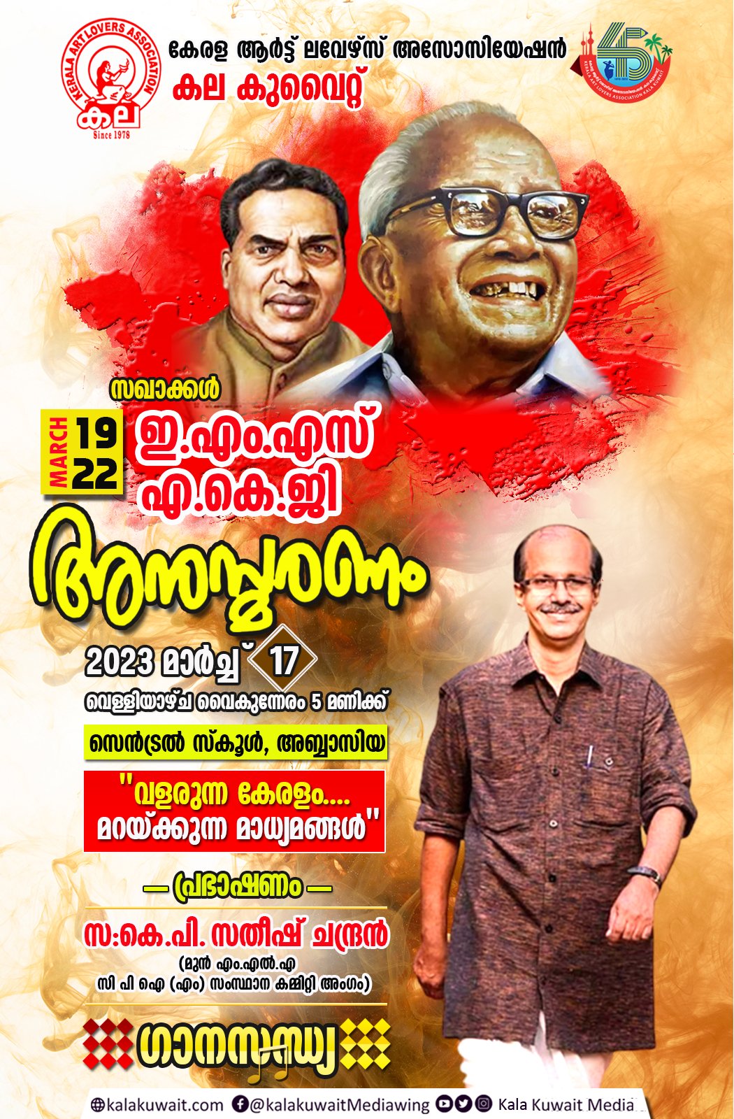 ആധുനിക കേരളത്തെ സൃഷ്ടിക്കുന്നതിൽ മഹത്തായ പങ്കുവഹിച്ചിട്ടുള്ള മഹാരഥന്മാരെ അനുസ്മരിക്കുന്നതിനോടനുബന്ധിച് ച് “വളരുന്ന കേരളം, മറയ്ക്കുന്ന മാധ്യമങ്ങൾ” എന്ന വിഷയത്തിൽ സംഘടിപ്പിക്കുന്ന സെമിനാറിൽ മുൻ എം എൽ എ യും സിപിഐ (എം) സംസ്ഥാന സമിതി അംഗവുമായ സഖാവ് കെ പി സതീഷ് ചന്ദ്രൻ മുഖ്യ പ്രഭാഷണം നടത്തുമെന്ന് കല കുവൈറ്റ് ഭാരവാഹികൾ അറിയിച്ചു. പ്രസ്തുത അനുസ്മരണ സമ്മേളനത്തിൽ കുവൈറ്റിലെ സാമൂഹ്യ സാംസ്കാരിക രംഗത്തെ വിവിധ നേതാക്കൾ പങ്കെടുക്കുന്നു .