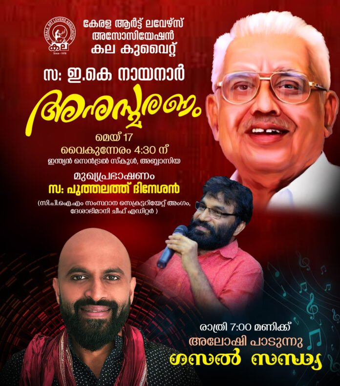 കുവൈറ്റ് സിറ്റി:കേരളത്തിന്റെ ജനകീയ മുഖ്യമന്ത്രിയും സിപിഐഎം പോളിംഗ് ബ്യൂറോ അംഗവുമായിരുന്ന സ. ഇ കെ നായനാരുടെ ഇരുപതാം ചരമവാർഷികത്തോട് അനുബന്ധിച്ച് കേരള ആർട്ട് ലവേഴ്സ് അസോസിയേഷൻ, കല കുവൈറ്റ് അനുസ്മരണ സമ്മേളനം സംഘടിപ്പിക്കുന്നു.മെയ് 17 വെള്ളിയാഴ്ച വൈകീട്ട് 4.30ന് ഇന്ത്യൻ സെൻട്രൽ സ്കൂൾ അബ്ബാസിയയിൽ നടക്കുന്ന പരിപാടിയിൽ സിപിഐഎം സംസ്ഥാന സെക്രട്ടറിയേറ്റ് അംഗം പുത്തലത്ത് ദിനേശൻ മുഖ്യ അതിഥിയായി പങ്കെടുക്കും. അനുസ്മരണ സമ്മേളനത്തോട് അനുബന്ധിച്ച് പ്രശസ്ത ഗസൽ ഗായകൻ അലോഷി നയിക്കുന്ന ഗസൽ സന്ധ്യ ഉണ്ടായിരിക്കും. പരിപാടിയിലേക്ക് മുഴുവൻ പ്രവാസി സുഹൃത്തുക്കളേയും സ്വാഗതം ചെയ്യുന്നതായി കല കുവൈറ്റ് ഭാരവാഹികൾ അറിയിച്ചു.