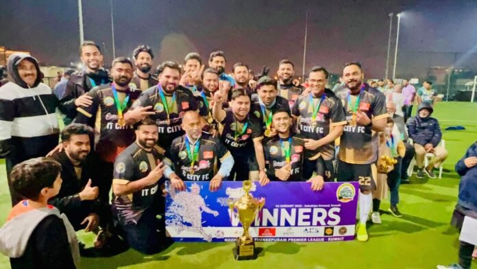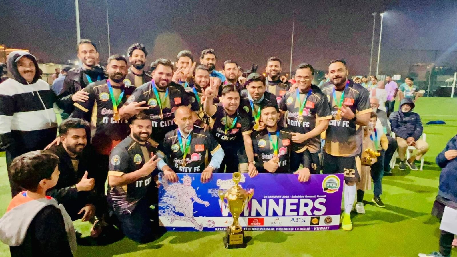 കുവൈറ്റ്‌ സിറ്റി : കോഴിക്കോട് തെക്കേപ്പുറം ടീം സംഘടിപ്പിച്ച മൂന്നാമത് 9A – സൈഡ് ഫുട്ബോൾ ടൂർണമെന്റിൽ ടീം ഐ. ടി. സിറ്റി ജേതാക്കളായി. ഫൈനലിൽ ടീം എ.സി.എസ്സിനെ പെനാൽറ്റി ഷുട്ടൗട്ടിലൂടെ പരാജയപ്പെടുത്തിയാണ് വിജയികളായത്. ടൂർണമെന്റിലെ മികച്ച കളിക്കാരനായി ഫഹദ് അബ്ദുല്ല, ഡിഫെന്ററായി മനീർഷ, ഗോൾകീപ്പറായി സലിം അബൂബക്കർ, ഫൈനലിലെ മാന് ഓഫ് ദ മാച്ച് ആയി ഹസ്സൻ ഷംസിനെയും തിരഞ്ഞെടുത്തു. ജേതാക്കൾക്കുള്ള ട്രോഫി മുഖ്യ സ്പോൺസറായ സ്വീറ്റ്‌കോ ഫുഡ്‌സ് ഷാഹുൽ ഹമീദ്, ജാസിം ഐ. ടി സിറ്റി, ഷാജഹാൻ ആംട്ടെൽ, കെ.ട്ടി.പി.എൽ പ്രസിഡന്റ് ഷംസുദ്ദീൻ അടക്കാനി എന്നിവർ കൈമാറി. 7 നും 15 നും വയസ്സിനിടയിലുള്ള കുട്ടികൾക്കുള്ള മത്സരങ്ങളും സംഘടിപ്പിച്ചു. ടീം സ്പോൺസർമാരായ അറബിയൻ കമ്പ്യൂട്ടർ സിസ്റ്റം, കെ.എൻ.ടി.സി, ഐ.ടി.സിറ്റി , ആംട്ടെൽ, ഡിസ്സി സ്റ്റോഴ്സ്, കോഴിക്കോടൻ സ്റ്റാർസ് എന്നിവർക്ക് കെ.പി.ട്ടി.എൽ. ഭാരവാഹികൾ നന്ദി പറഞ്ഞു.