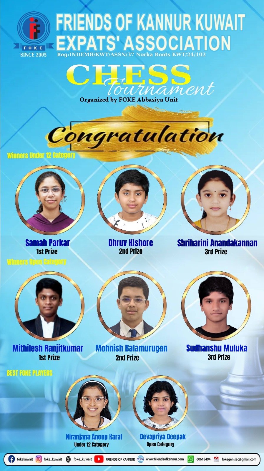 12 വയസ്സിനു താഴെയുള്ള വിഭാഗത്തിൽ സമ പാർക്കർ, ധ്രുവ് കിഷോർ, ശ്രീഹരണി അനന്ദകണ്ണൻ എന്നിവരും , 12 വയസ്സിനു മുകളിലുള്ളവരുടെ വിഭാഗത്തിൽ മിഥിലേഷ് രഞ്ജിത്കുമാർ, മോഹനിഷ് ബലമുരുഗൻ, സുധാൻഷു മുളുക എന്നിവരും ഒന്നും രണ്ടും മൂന്നും സ്ഥാനങ്ങൾക്കുള്ള ക്യാഷ് അവാർഡും, മെഡലും പ്രശസ്ത്രി പത്രവും കരസ്ഥമാക്കി. മത്സരത്തിൽ പങ്കെടുത്ത ഫോക്ക് അംഗങ്ങളിൽ നിന്നും മികച്ച പ്രകടനം കാഴ്ച വച്ച ദേവപ്രിയ ദീപക്, നിരഞ്ജന അനൂപ് എന്നിവർക്ക് പ്രത്യേക ഉപഹാരവും കൈമാറി. അബ്ബാസിയ യൂണിറ്റ് സെക്രട്ടറി ഷാജി ഭാസ്കർ സ്വാഗതം ആശംസിച്ച ചടങ്ങിൽ പ്രോഗ്രാം കൺവീനർ വിനോയ് വിത്സൻ നന്ദി പറഞ്ഞു.