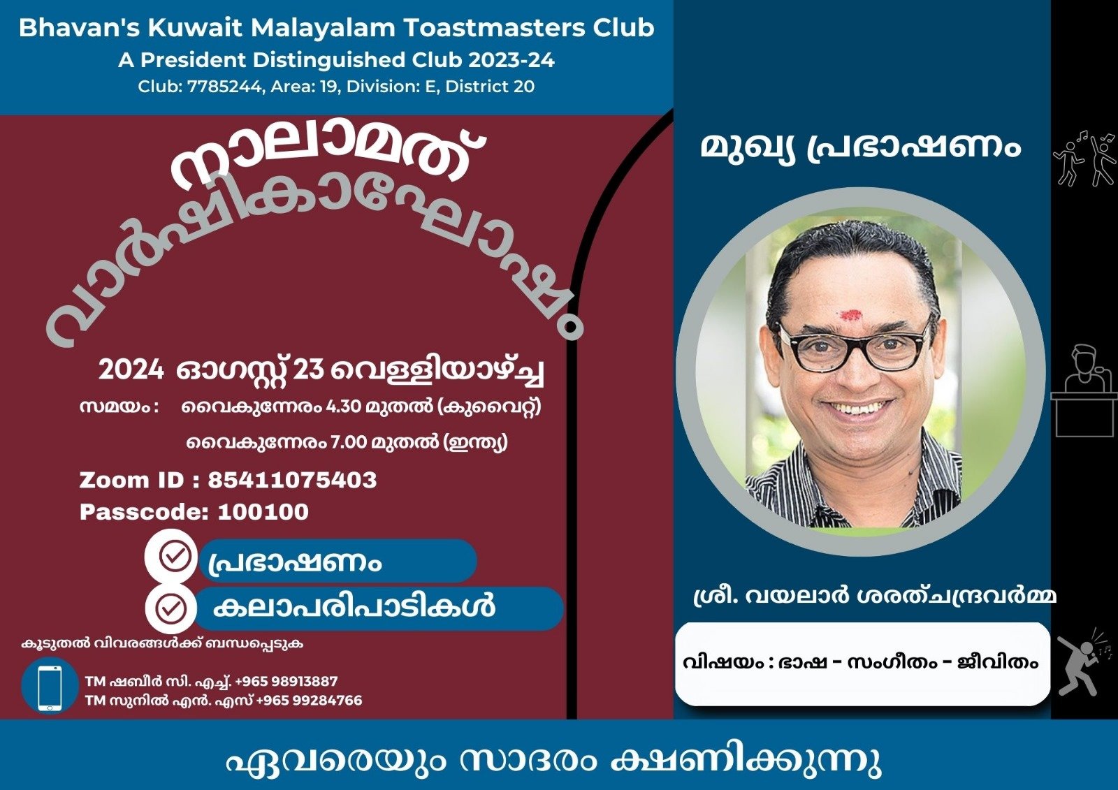 Home Kuwait Associations ഭവൻസ് കുവൈറ്റ് മലയാളം ടോസ്റ്റ് മാസ്റ്റേഴ്സ് ക്ലബ് നാലാം വാർഷികം 23ന് : വയലാർ ശരത്ചന്ദ്രവർമ്മ...
