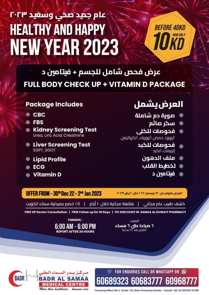 കുവൈത്തിലെ പ്രമുഖ ആതുരാലയ ശൃംഖലയായ ബദർ അൽ സമാ മെഡിക്കൽ സെന്റർ വെറും 10 ദിനാറിന് ഫുട്ബോൾ ചെക്കപ്പും വൈറ്റമിൻ പരിശോധനയും അടങ്ങിയ പാക്കേജ് അവതരിപ്പിക്കുന്നു. ഡിസംബർ 30 മുതൽ ജനുവരി 2 വരെ യാ ണ് കാലാവധി ‘