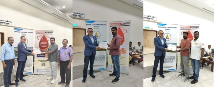 കുവൈറ്റ് സിറ്റി : 2026 ഏപ്രിൽ 25-ന് അദാൻ ബ്ലഡ് ട്രാൻസ്ഫ്യൂഷൻ സെന്ററിൽ ബെംഗാളി കൾച്ചറൽ സൊസൈറ്റി കുവൈത്ത്, ബ്ലഡ് ഡോണേഴ്സ് കേരള കുവൈത്ത് ചാപ്റ്റർ എന്നിവയുടെ സംയുക്താഭിമുഖ്യത്തിൽ വിജയകരമായ മിനി രക്തദാന ക്യാമ്പ് സംഘടിപ്പിച്ചു. ക്യാമ്പിൽ പങ്കെടുത്ത എല്ലാ രക്തദാതാക്കളെയും ആദരിച്ച് സർട്ടിഫിക്കറ്റുകൾ വിതരണം ചെയ്തു.