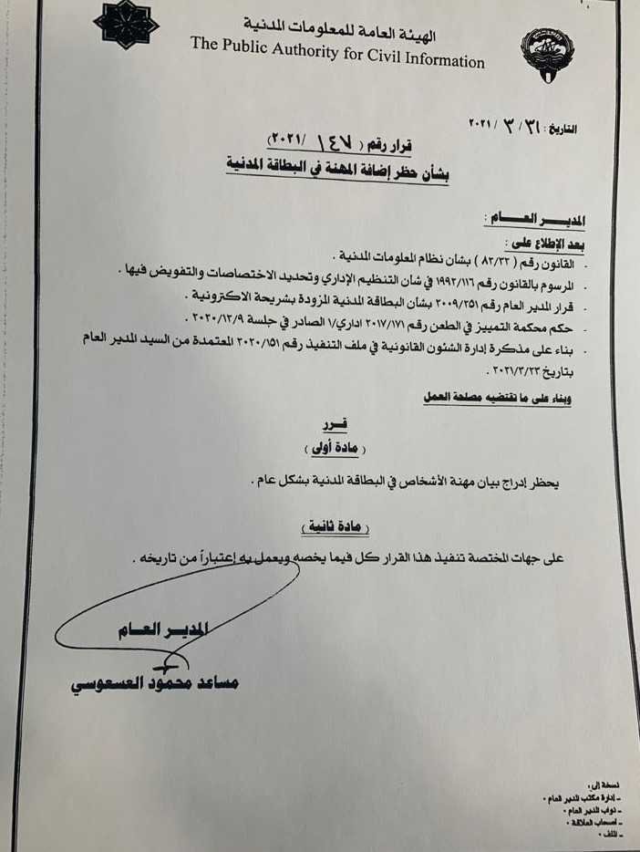 കുവൈത്ത് സിറ്റി കുവൈത്തിൽ സിവിൽ ഐഡിയിൽ വ്യക്തികളുടെ തൊഴിൽ രേഖപ്പെടുത്തുന്നത് നിരോധിച്ചു. പബ്ലിക് അതോറിറ്റി ഫോർ സിവിൽ ഇൻഫർമേഷൻ ജനറൽ ഡയറക്ടർ മുസീദ് അൽ അസൂസിയാണ് ഇതുസംബന്ധിച്ച് ഉത്തരവിറക്കിയത്.ഡിസംബർ ഒൻപതിന് പുറപ്പെടുവിച്ച കോടതിയുടെ വിധി നടപ്പാക്കുന്നതിന് നിയമകാര്യ വകുപ്പ് സമർപ്പിച്ച മെമ്മോറാണ്ടത്തിന്റെ അടിസ്ഥാനത്തിലാണ് അൽ അസൂസിയുടെ തീരുമാനം.2021 മാർച്ച് 31 മുതൽ ഇത് നടപ്പിലാക്കും.