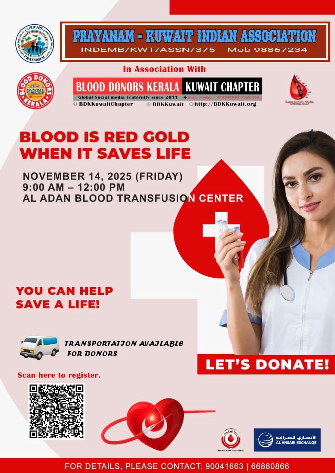 കുവൈറ്റ് സിറ്റി : പ്രയാണം – കുവൈറ്റ് ഇന്ത്യൻ അസോസിയേഷൻ , ബ്ളഡ് ഡോണേഴ്സ് കേരള കുവൈറ്റ് ചാപ്റ്ററുമായി ചേർന്ന് നവംബർ 14 വെള്ളിയാഴ്ച, രാവിലെ 9.00 മുതൽ 12.00 വരെ അൽ അദാൻ ബ്ലഡ് ട്രാൻസ്ഫ്യൂഷൻ സെന്ററിൽ രക്തദാന ക്യാമ്പ്