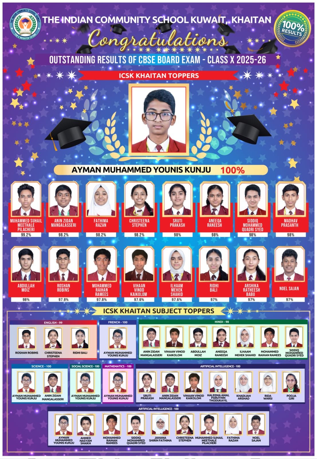 കുവൈത്ത് സിറ്റി: സിബിഎസ്ഇ പത്താം ക്ലാസ് ഫലം വന്നതോടെ മികച്ച വിജയം നേടി ഇന്ത്യൻ കമ്മ്യൂണിറ്റി സ്കൂൾ, ഖൈത്താൻ. എല്ലാ വിഷയങ്ങളിലുമായി വിദ്യാർത്ഥികൾ മികച്ച പ്രകടനം കാഴ്ചവെച്ചു. 100 ശതമാനം വിജയം നേടിയതോടെ സ്കൂൾ കൈവരിച്ചത് അഭിമാന നേട്ടം.
