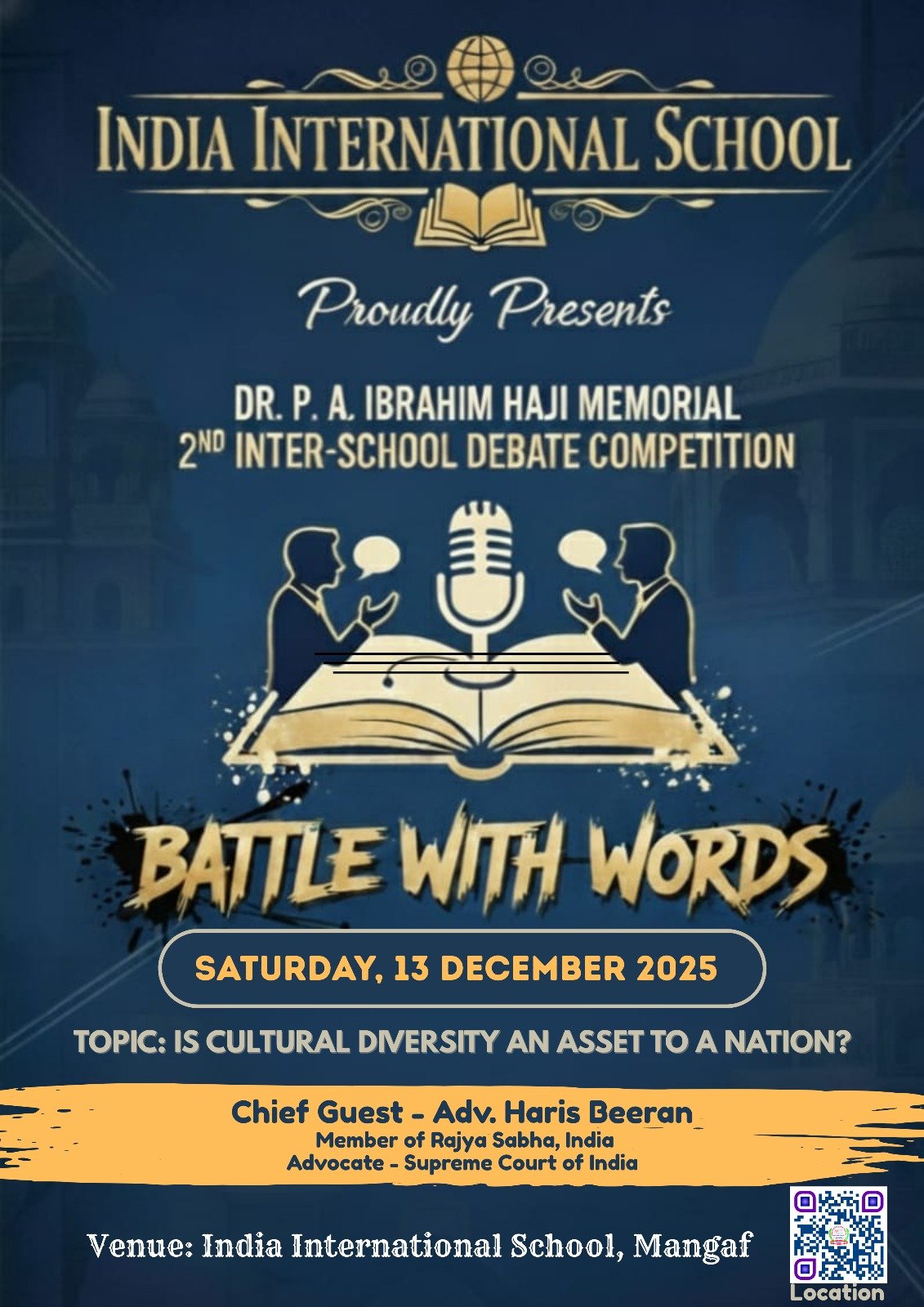 കുവൈറ്റ്: വിദ്യാർത്ഥി സമൂഹത്തിന്റെ ചിന്താശേഷിക്കും സംവാദപാടവത്തിനും പ്രോത്സാഹനം നൽകിക്കൊണ്ട് മംഗഫിലെ ഇന്ത്യ ഇന്റർനാഷനൽ സ്കൂൾ അവരുടെ സ്ഥാപക ചെയർമാൻ ഡോ. പി. ഇബ്രാഹിം ഹാജിയുടെ സ്മരണാർത്ഥമുള്ള രണ്ടാമത് ഇന്റർ സ്കൂൾ സംവാദ മത്സരം ഡിസംബർ 13, ശനിയാഴ്ച ഉച്ചയ്ക്ക് 2 മണിക്ക് സ്കൂൾ ഓഡിറ്റോറിയത്തിൽ നടക്കും. കുവൈത്തിലെ 16 സിബിഎസ്ഇ സ്കൂളുകളിൽ നിന്നുള്ള 32 മിടുക്കരായ വിദ്യാർത്ഥികളാണ് മത്സരത്തിൽ പങ്കെടുക്കുന്നത്. ഈ വർഷത്തെ സംവാദ വിഷയം ശ്രദ്ധേയമാണ്: “സാംസ്കാരിക വൈവിധ്യം ഒരു രാഷ്ട്രത്തിന് മുതൽക്കൂട്ട് ആണോ? (Is Cultural Diversity an Asset to a Nation?)”.