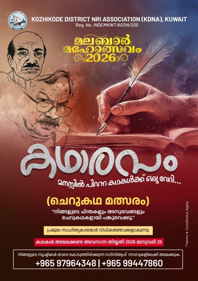 കുവൈത്ത് സിറ്റി: കോഴിക്കോട് ഡിസ്ട്രിക്ട് എൻ.ആർ.ഐ അസോസിയേഷൻ (കെ.ഡി.എൻ.എ) 2026 ഫെബ്രുവരി 13ന് നടക്കുന്ന മലബാർ മഹോത്സവത്തോടനുബന്ധിച്ച് സംഘടിപ്പിക്കുന്ന “കഥാരസം” ചെറുകഥ മത്സരത്തിലേക്ക് എൻട്രികൾ ക്ഷണിക്കുന്നു. പ്രമുഖ സാഹിത്യകാരന്മാർ വിധികർത്താക്കളാവുന്ന മത്സരത്തിൽ, കുവൈത്ത് പ്രവാസികൾക്ക് പ്രായ ഭേദമന്യേ പങ്കെടുക്കാം. സൃഷിടികൾ kdnakuwait@gmail.com അഥവാ krishnankadalundi@gmail.com എന്നീ ഇമെയിൽ ഐഡിയിലോ 97964348, 99447860 എന്നീ വാട്സ്ആപ്പ് നമ്പറുകളിലേക്കോ അയക്കാവുന്നതാണ്. കഥകൾ അയക്കേണ്ട അവസാന തീയതി 2026 ജനുവരി 25 വൈകുന്നേരം 7 മണി. വിജയികൾക്ക് മലബാർ മഹോത്സവം വേദിയിൽ (ഇന്ത്യൻ സെൻട്രൽ സ്കൂൾ ഓപ്പൺ ഗ്രൗണ്ട്) വെച്ച് ആദരവും പ്രശംസാ പത്രവും സമ്മാനിക്കുമെന്ന് സംഘാടകർ അറിയിച്ചു.