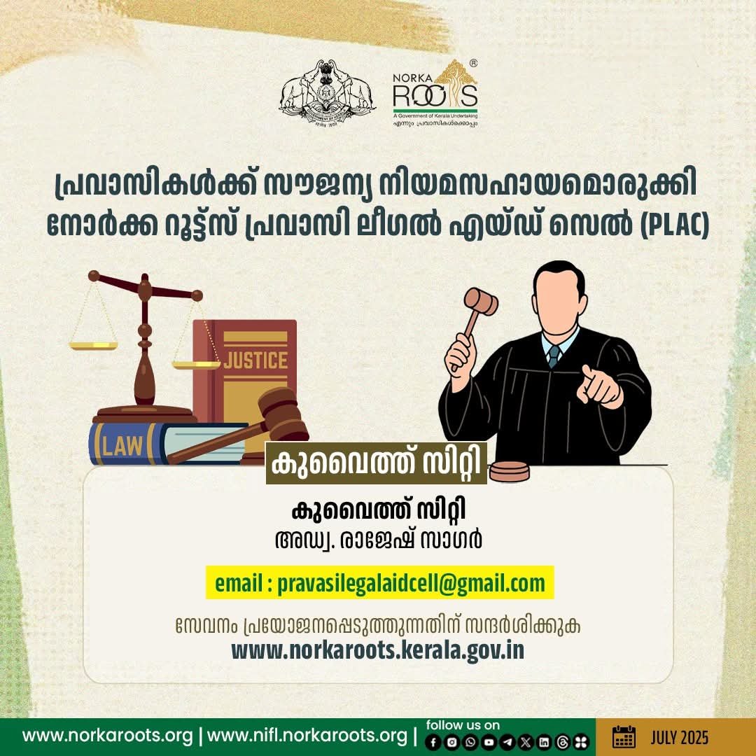 വിദേശരാജ്യങ്ങളിലെ കേരളീയര്ക്ക് സൗജന്യ നിയമോപദേശം ലഭ്യമാക്കുന്ന നോര്ക്ക റൂട്ട്സിന്റെ പ്രവാസി ലീഗല് എയ്ഡ് സെല്ലില് (PLAC) സൗദി അറേബ്യ, യുണൈറ്റഡ് അറബ് എമിറേറ്റ്സ് (യു.എ,ഇ), കുവൈറ്റ് എന്നീ രാജ്യങ്ങളില് ഏഴു ലീഗല് കണ്സള്ട്ടന്റുമാരുടെ സേവനം ലഭ്യമാണ്. യു.എ.ഇയിലെ ഷാര്ജ, ദുബായ് മേഖലയില് അഡ്വ. മനു ഗംഗാധരന് അഡ്വ. അനല ഷിബു എന്നിവരും, അബുദാബിയില് അഡ്വ. സാബു രത്നാകരന് അഡ്വ. സലീം ചൊളമുക്കത്ത് എന്നിവരുടെ സേവനവും ലഭ്യമാണ്. കുവൈത്ത് സിറ്റിയില് അഡ്വ. രാജേഷ് സാഗര് സൗദി അറേബ്യയിലെ ജിദ്ദയില് അഡ്വ. ഷംസുദ്ദീന് ഒലശ്ശേരി ദമ്മാമില് അഡ്വ. തോമസ് പി.എം എന്നിവരാണ് നോര്ക്ക ലീഗല് കണ്സള്ട്ടന്റുമാര്. വിദേശ രാജ്യങ്ങളിലെ നിയമത്തെക്കുറിച്ചുള്ള അജ്ഞതകൊണ്ടും, തന്റെതല്ലാത്ത കാരണങ്ങളാലും നിയമക്കുരുക്കില് അകപ്പെടുന്ന പ്രവാസികേരളീയര്ക്കായി സംസ്ഥാന സര്ക്കാര് നോര്ക്ക റൂട്ട്സ് വഴി നടപ്പിലാക്കുന്ന പദ്ധതിയാണ് പ്രവാസി ലീഗല് എയ്ഡ് സെല്.