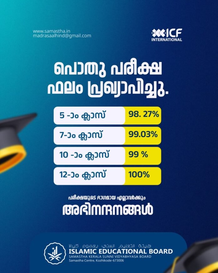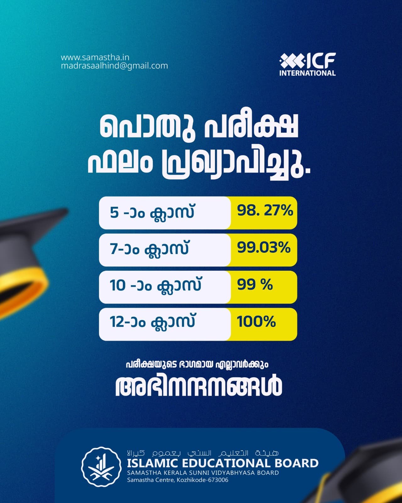 കുവൈറ്റ് സിറ്റി: ഇസ്ലാമിക് എജ്യൂക്കേഷണല് ബോര്ഡ് 2026 ഏപ്രില് 03, 04, 05 തിയ്യതികളില് യു.എ.ഇ, ഒമാന്, ബഹ്റൈന്, സൗദി അറേബ്യ, കുവൈത്ത്, ഖത്തര് എന്നീ ഗള്ഫ് രാജ്യങ്ങളില് നടത്തിയ അഞ്ച്, ഏഴ്, പത്ത്, പന്ത്രണ്ട് ക്ലാസ്സുകളിലെ മദ്റസാ പൊതുപരീക്ഷാ ഫലം പ്രഖ്യാപിച്ചു. www.samastha.in എന്ന വെബ്സൈറ്റില് പരീക്ഷാഫലം ലഭ്യമാണ്. 98 സെന്ററുകളിലായി 2516 വിദ്യാര്ത്ഥികള് പരീക്ഷ എഴുതിയതില് 2503 പേര് ഉപരിപഠനത്തിന് അര്ഹരായി. 160 സൂപ്പര്വൈസര്മാരുടെയും 15 സൂപ്രണ്ടുമാരുടെയും നേതൃത്വത്തിലാണ് പരീക്ഷകള് നടത്തിയത്.അഞ്ചാം തരത്തില് 98.27 ശതമാനവും ഏഴാം തരത്തില് 99.03 ശതമാനവും പത്താം തരത്തില് 99 ശതമാനവും പന്ത്രണ്ടാം തരത്തില് 100 ശതമാനവും കുട്ടികള് ഉപരിപഠനത്തിന് അര്ഹത നേടി.