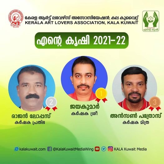 “എന്റെ കൃഷി 2021 – 22 ” കാര്ഷിക മത്സരത്തിന്റെ വിജയികളെ പ്രഖ്യാപിച്ചു. അബുഹലീഫ മേഖലയിൽ നിന്നുള്ള ജയകുമാർ “കർഷകശ്രീ” (ഒന്നാം സ്ഥാനം) പുരസ്കാരവും, “കർഷക പ്രതിഭ” (രണ്ടാം സ്ഥാനം) പുരസ്കാരം അബ്ബാസിയ മേഖലയിൽ നിന്നുള്ള രാജൻ ലോപ്പസും , “കർഷക മിത്ര” (മൂന്നാം സ്ഥാനം) പുരസ്കാരം അബ്ബാസിയ മേഖലയിൽ നിന്നുള്ള അൻസൺ പത്രോസും നേടി. കല കുവൈറ്റിന്റെ 4 മേഖലകളിൽ നിന്നായി 19 പേർക്കുള്ള പ്രോത്സാഹന സമ്മാനവും പ്രഖ്യാപിച്ചിട്ടുണ്ട്. അഞ്ഞൂറോളം (500) മൽസരാർഥികളാണു നവംബർ മുതൽ മാർച്ച് വരെ 5 മാസക്കാലം ഫ്ളാറ്റുകളിലും, ബാൽക്കണികളിലും, ലഭിച്ച സ്ഥലങ്ങളിലും കൃഷി ചെയ്ത് ഈ മത്സരത്തിൽ പങ്കാളികളായത്. കൃഷി ചെയ്യുന്ന ഇനങ്ങളുടെ വൈവിദ്ധ്യം, കാര്ഷിക ഇനങ്ങള് ഒരുക്കിയിരിക്കുന്ന രീതി, അനുവര്ത്തിക്കുന്ന കൃഷി രീതികള്, കുടുംബാംഗങ്ങളുടെ പങ്കാളിത്തം, ദൈനംദിന പരിചരണത്തിലും കൃഷി രീതികള് സ്വായത്തമാക്കുന്നതിലുമുള്ള കുട്ടികളുടെ പങ്കാളിത്തം എന്നിവ മാനദണ്ഡമാക്കിയാണ് വിജയികളെ തിരഞ്ഞെടുത്തത്. ഫഹാഹീൽ മേഖലയിൽ നിന്ന് സജി ജോർജ് , ജയൻ വർഗീസ് ,സുനിൽ സണ്ണി ,ഷിജു സിൽമോൻ ,ജെയിൻ കുര്യൻ അബുഹലീഫ മേഖലയിൽ നിന്ന് രാജൻ തോട്ടത്തിൽ ,സുരേഷ് ബാബു ,അഷ്റഫ് ,അലക്സ് സി ചാണ്ടി ,സ്റ്റീഫൻ സാൽമിയ മേഖലയിൽ നിന്ന് ഷൈബു കരുൺ,ബേബി തോമസ് ,ഷിനി ,ജസ്റ്റിൻ അബ്ബാസിയ മേഖലയിൽ നിന്ന് സന്തോഷ് എം ബി,ലിബു ടൈറ്റസ് ,സന്തോഷ് ,ജിവിൻ &ബിനീഷ് ,ജിനോ ഫിലിപ്പ് എന്നിവർ പ്രോത്സാഹന സമ്മാനങ്ങൾക്ക് അർഹരായി. വിജയികൾക്ക് എല്ലാവിധ ആശംസകളും,അഭിനന്ദനങ്ങളും അറിയിക്കുന്നതായി കല കുവൈറ്റ് ആക്ടിങ് പ്രസിഡന്റ് ശൈമേഷ് , ജനറൽ സെക്രട്ടറി ജെ സജി എന്നിവർ പറഞ്ഞു.