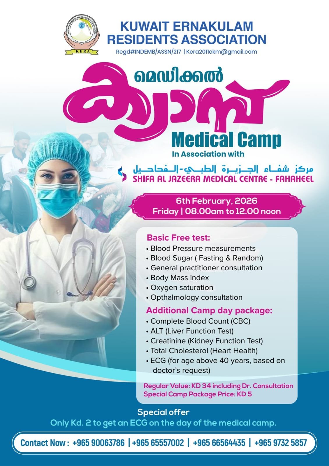 കുവൈത്ത് സിറ്റി : കുവൈത്ത് എറണാകുളം റസിഡൻസ് അസോസിയേഷൻ 2026 ഫെബ്രുവരി ആറാം തീയതി വെള്ളിയാഴ്ച ഷിഫാ അൽ ജസീറ ഫഹാഹീൽ ബ്രാഞ്ച്മായി സഹകരിച്ച് രാവിലെ എട്ടു മുതൽ സൗജന്യ മെഡിക്കൽ ക്യാമ്പ് നടത്തുന്നു. അന്നേദിവസം ക്യാമ്പിൽ എത്തുന്നവർക്ക് ബ്ലഡ് പ്രഷർ, ബ്ലഡ് ഷുഗർ, ഡോക്ടർ കൺസൾട്ടേഷൻ സൗജന്യമായിരിക്കും. കൂടാതെ 34 ദിനാർ ഫീസ് ഉള്ള ഫുൾ ബോഡി ചെക്കപ്പ് 5 ദിനാറിന് ചെയ്യുവാൻ സാധിക്കും. കൂടുതൽ വിവരങ്ങൾക്ക് ബന്ധപ്പെടുക – 9006 3786, 6555 7002, 9732 5857, 66564435.