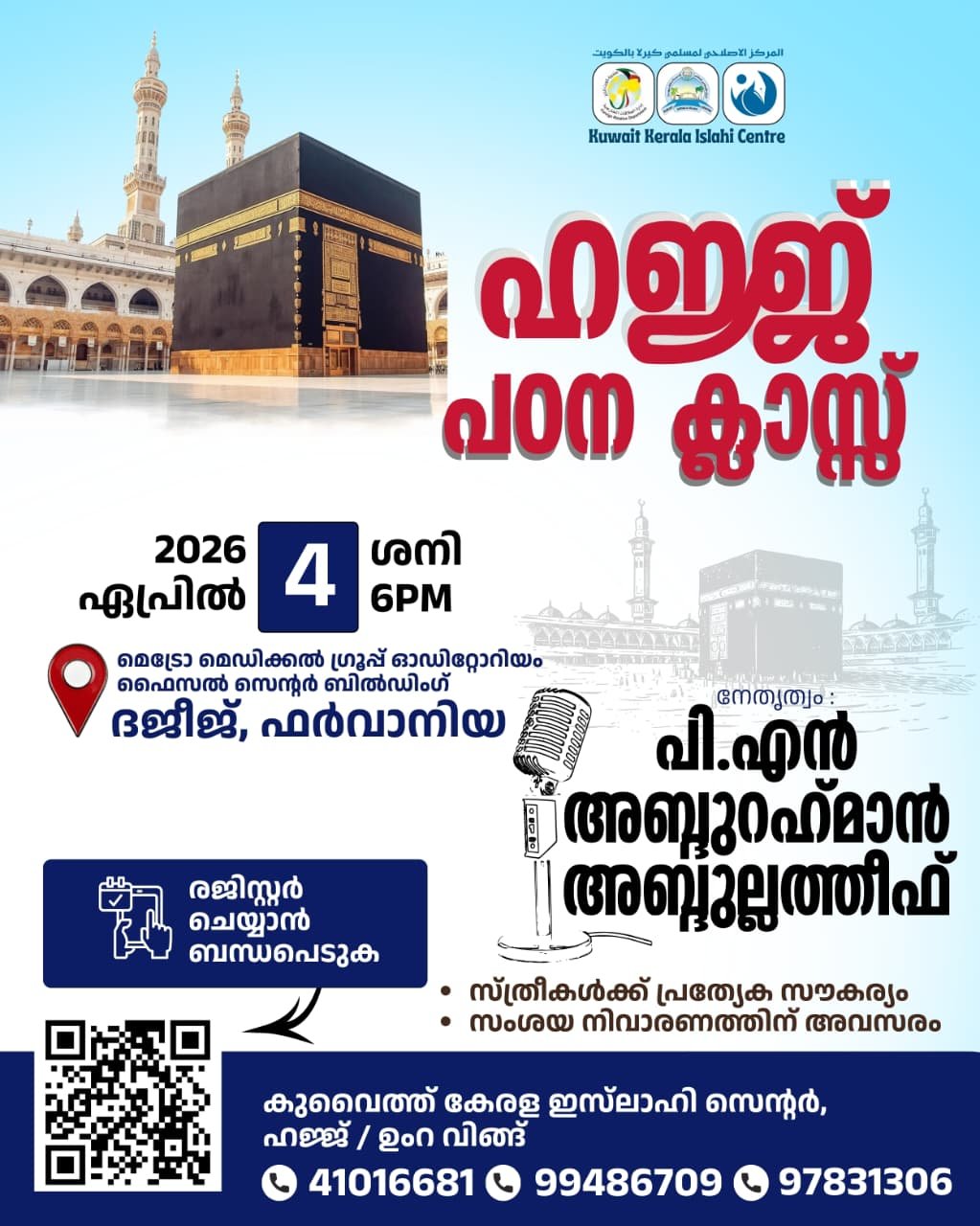 കുവൈറ്റ് സിറ്റി : കുവൈത്തിൽ നിന്നും, നാട്ടിൽ നിന്നും ഇത്തവണത്തെ പരിശുദ്ധ ഹജ്ജ് കർമ്മത്തിന് പോകുന്നവർക്കായി കുവൈത്ത് കേരള ഇസ്ലാഹീ സെന്റർ ഹജ്ജ് ഉംറ വിംഗിന്റെ കീഴിൽ ഹജ്ജ് പഠന ക്ലാസ്സും, ഹജ്ജിന് പോകുന്നവർക്കായി യാത്രയയപ്പും സംഘടിപ്പിക്കുന്നു.