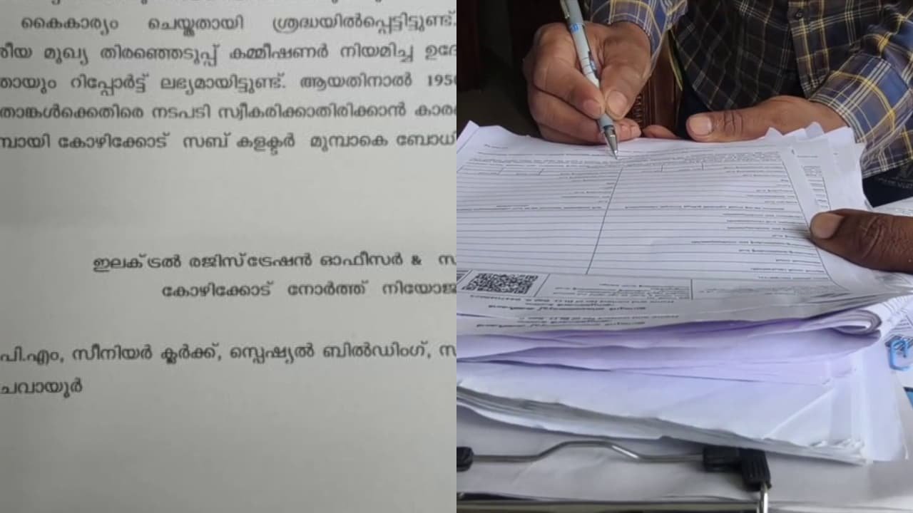 കോഴിക്കോട്: ബിഎല്ഒയ്ക്ക് കാരണം കാണിക്കല് നോട്ടീസ് നല്കി കോഴിക്കോട് സബ് കളക്ടര്. അസ്ലം പിഎം എന്ന ബിഎല്ഒയ്ക്കാണ് കാരണം കാണിക്കല് നോട്ടീസ് നല്കിയത്. എസ്ഐആറിന്റെ എന്യുമറേഷന് ഫോമുകള് വിതരണം ചെയ്തതിലെ കുറവ് ചൂണ്ടിക്കാട്ടിയാണ് നോട്ടീസ് അയച്ചത്. ഏല്പ്പിച്ച ജോലി നിരുത്തരവാദിത്വപരമായി കൈകാര്യം ചെയ്തെന്ന് നോട്ടീസില് പറയുന്നു. നവംബര് 15ന് മുമ്പായി കാരണം ബോധ്യപ്പെടുത്തണമെന്നും നോട്ടീസില് പറയുന്നു. 984 വോട്ടര്മാരില് 390 പേര്ക്കാണ് ബിഎല്ഒ ഫോം നല്കിയത്.