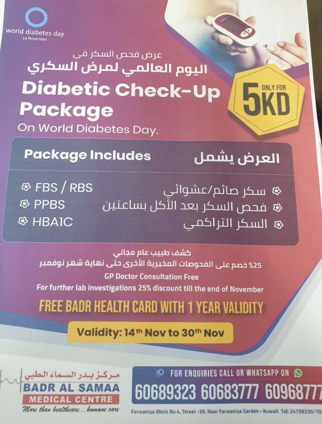 കുവൈത്ത് സിറ്റി : കുവൈത്തിലെ പ്രമുഖ ആതുരാലയ ശൃംഖലയായ ബദർ അൽ സമാ മെഡിക്കൽ സെന്റർ ലോക പ്രമേഹ ദിനത്തോടനുബന്ധിച്ച് പ്രത്യേക ഡയബറ്റിക് ചെക്ക്-അപ്പ് പാക്കേജ് പ്രഖ്യാപിച്ചു. വെറും 5 KD യുടെ പാക്കേജിൽ ഉൾപ്പെടുന്നവ സേവനങ്ങൾ – FBS/RBS, PPBS, HBAIC . ഇവ കൂടാതെ സൗജന്യ ഡോക്ടർ കൺസൾട്ടേഷനും നവംബർ അവസാനം വരെ ലാബ് പരിശോധനകൾക്ക് 25% എക്സ്ക്ലൂസീവ് ഡിസ്കൗണ്ടും ലഭിക്കുന്നതാണ് അതോടൊപ്പം. 1 വർഷാ കാലാവധിയുള്ള സൗജന്യ ബദ്ർ ഹെൽത്ത് കാർഡും നൽകുന്നുണ്ട്. ഈ ഓഫർ നവംബർ കാലാവധി 14 മുതൽ നവംബർ 30 വരെയാണ്