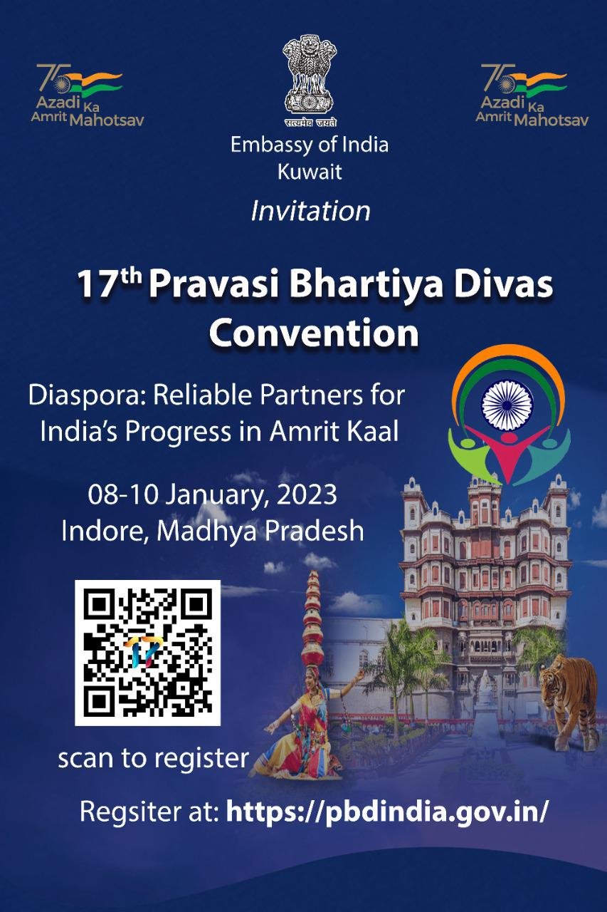 പ്രവാസി ഇന്ത്യക്കാരുടെ സംഗമമായ ‘പ്രവാസി ഭാരതീയ ദിവസ് 2023’-ന് മധ്യപ്രദേശ് ആണ് ആതിഥേയത്വം വഹിക്കുന്നത് .2023 ജനുവരി 8 മുതൽ 10 വരെ- ഇൻഡോറിൽ നടക്കുന്ന പരിപാടിയിൽ പങ്കെടുക്കാൻ പ്രവാസികളെ ക്ഷണിക്കുന്നതായി കുവൈറ്റിലെ ഇന്ത്യൻ എംബസി അറിയിച്ചു. പരിപാടിയിൽ പങ്കെടുക്കുന്നതിനായി എല്ലാ ഇന്ത്യന് അസോസിയേഷനുകളിൽ നിന്നും അംഗങ്ങൾ രജിസ്ട്രേഷൻ നടത്തണം.