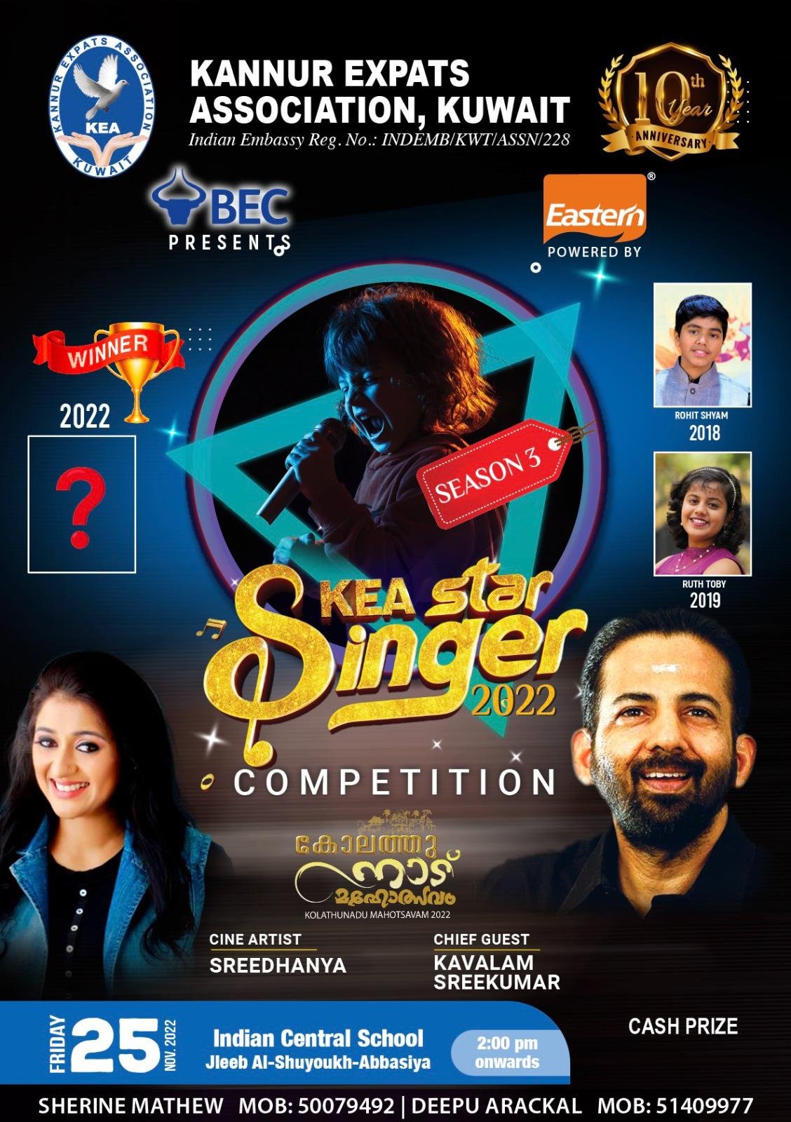 കുവൈത്ത്സിറ്റി: കണ്ണൂര് എക്സ് പാറ്റ്സ് അസോസിയേഷന്(കെ.ഇ.എ) കുവൈറ്റിന്റെ ആഭിമുഖ്യത്തില് നടത്തുന്ന ‘കോലത്തുനാട് മഹോത്സവം’ഇന്ന് വെള്ളിയാഴ്ച നടക്കും.അബ്ബാസിയ ഇന്ത്യന് സെന്ട്രല് സ്കൂള് ഓഡിറ്റോറിയത്തിലാണ് പരിപാടി. ‘കോലത്തുനാട് മഹോത്സവത്തിന്റെ ഭാഗമായി ഒരുക്കി വരുന്ന സ്റ്റാര് സിംഗര് കോമ്പറ്റീഷന്റെ ഫൈനല് ഉച്ചയ്ക്ക് 2 മണി മുതലാരംഭിക്കും.പ്രശസ്ത സംഗീത സംവിധായകന് കാവാലം ശ്രീകുമാര് ,ചലച്ചിത്ര താരം ശ്രീധന്യ,ഗായകരായ ഭാഗ്യരാജ്,അനാമിക എന്നിവരുടെ സാന്നിധ്യത്തിലാണ് ഫൈനല് മത്സരം സംഘടിപ്പിക്കുന്നത്.കണ്ണൂര് എക്സ് പാറ്റ്സ് അസോസിയേഷന് കുവൈറ്റ് ആഭിമുഖ്യത്തില് നടത്തുന്നു സ്റ്റാര് സിംഗര് കോമ്പറ്റീഷന്റെ മൂന്നാമത്തെ എഡിഷനാണീത്.വൈകുനേരം അഞ്ചരയക്ക് നടക്കുന്ന പൊതുസമ്മേളനം കുവൈത്തിലെ ബൂട്ടാന് അംബാസഡര് ചിറ്റം ടെന്സിണ് ഉദ്ഘാടനം ചെയ്യും. പ്രസിഡന്റ് റോയ് ആന്ഡ്രൂസ് അധ്യക്ഷത വഹിക്കുന്ന ചടങ്ങില് ചീഫ് കോഓര്ഡിനേറ്റര് ഷെറിന് മാത്യു, ജനറല് സെക്രട്ടറി ദീപു അറക്കല്,വൈസ് പ്രസിഡന്റ് സന്തോഷ് കുമാര്,ട്രഷറര് ഹരീന്ദ്രന്