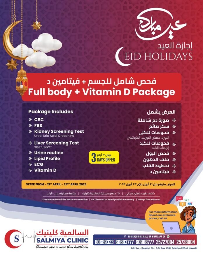 കുവൈറ്റ് സിറ്റി: ഈദ് അവധി ദിവസങ്ങളിൽ സാൽമിയ ക്ലിനിക്ക് ഏർപ്പെടുത്തിയ പ്രത്യേക ഹെൽത്ത് ചെക്കപ്പ് പാക്കേജ് കാലാവധി നീട്ടി . ഏപ്രിൽ 30 വരെയാണ് കാലയളവ് നീട്ടിയത്. ഫുൾ ബോഡി ചെക്ക്-അപ്പ് + വിറ്റാമിൻ ഡി പരിശോധനകളുടെ മികച്ച ഓഫർ ആണ് ഇതിലൂടെ ലഭിക്കുന്നത്.