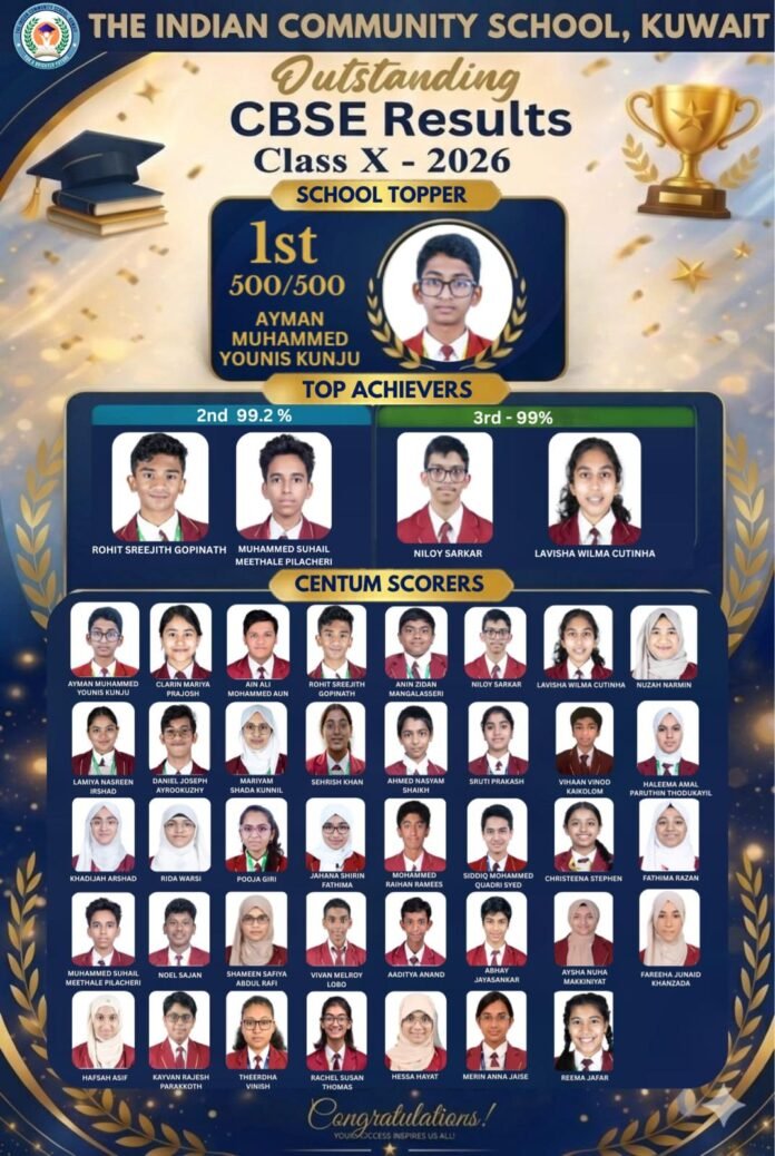 The Indian Community School, Kuwait has set a new benchmark in academic excellence with an outstanding performance in the CBSE Class X examinations 2025 -26, achieving a 100% pass result and record-breaking student distinctions. Out of 561 students who appeared for the examination, an extraordinary 229 students scored 90% and above, while 520 earned distinctions, marking a record that will be remembered with pride for years to come.