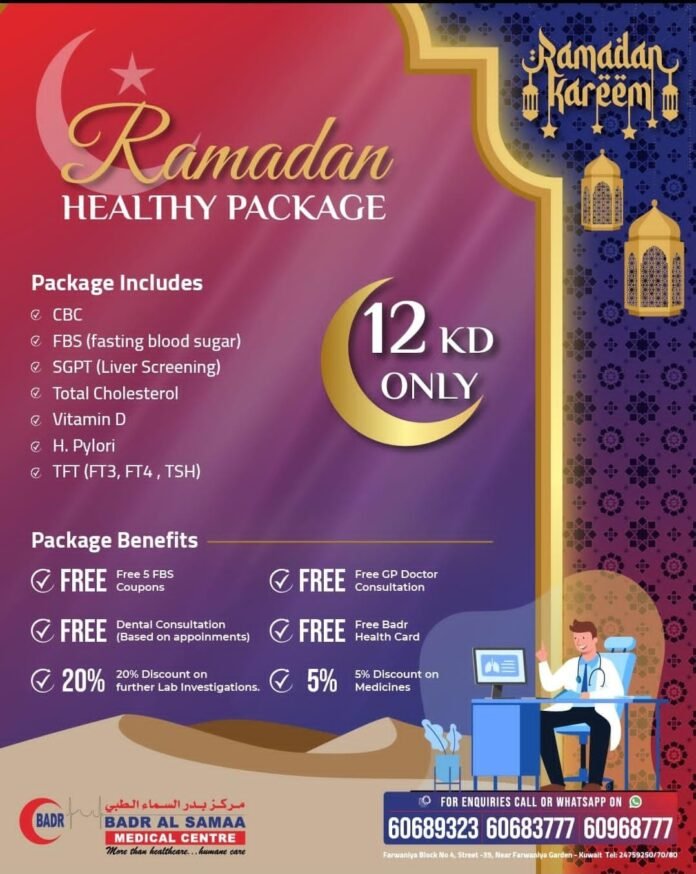 കുവൈത്ത് സിറ്റി: വിശുദ്ധ റമദാൻ മാസത്തിൽ പ്രത്യേക ഹെൽത്ത് പാക്കേജുമായി പ്രമുഖ ആതുരാലയ ശൃംഖലയായ ബദർ അൽ സമ മെഡിക്കൽ സെൻറർ. വെറും 12 ദിനാർ മാത്രമുള്ള ഹെൽത്ത് പാക്കേജിന് ഉൾപ്പെടുന്നു സേവനങ്ങൾ: