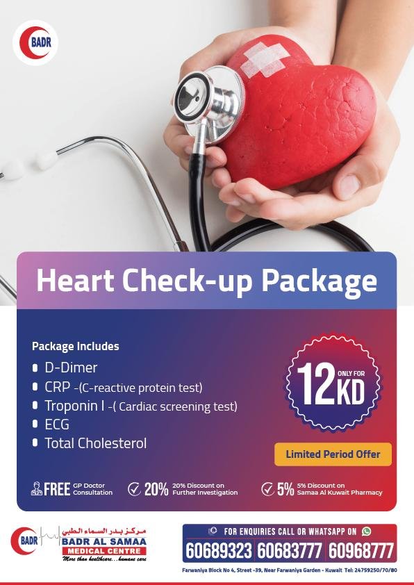 കുവൈത്ത് സിറ്റി: 12 ദിനാറിന് ഹാർട്ട് ചെക്ക്-അപ്പ് പാക്കേജുമായി ബദർ അൽ സമ മെഡിക്കൽ സെൻറർ. ജൂൺ 21- മുതൽ പരിമിത കാലയളവിലേക്ക് ഈ ഓഫർ ലഭിക്കുന്നതായിരിക്കും.