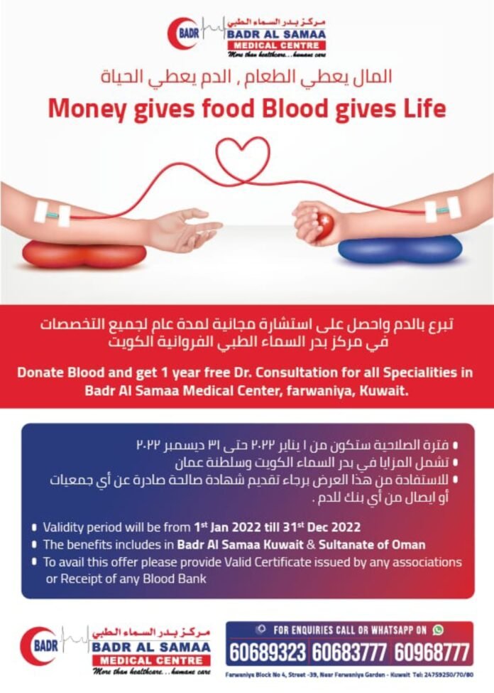 കുവൈത്ത് സിറ്റി: ബദർ അൽ സമാ ഗ്രൂപ്പ് ഓഫ് ഹോസ്പിറ്റൽസ് ആൻഡ് മെഡിക്കൽ സെന്റർ ഡയറക്ടർമാരായ ഡോ. മുഹമ്മദ് പി.എ, അബ്ദുൾ ലത്തീഫ്, ഡോ. ശരത് ചന്ദ്ര (സിഇഒ) എന്നിവർ രക്തദാനം ചെയ്യുന്നവർക്ക് സൗജന്യ ഡോക്ടർ കൺസൾട്ടേഷന് ലഭിക്കുമെന്ന് അറിയിച്ചു . ഈ ഓഫർ ലഭിക്കുക ഒരു വർഷത്തേക്കാണ്, ജനുവരി 1 മുതൽ ഡിസംബർ 31 വരെ. ഈ ഓഫർ ലഭിക്കുന്നതിന് ഏതെങ്കിലും അസോസിയേഷൻ സർട്ടിഫിക്കറ്റ് അല്ലെങ്കിൽ ഏതെങ്കിലും രക്തബാങ്കിന്റെ രസീത് നൽകിയാൽ മതി