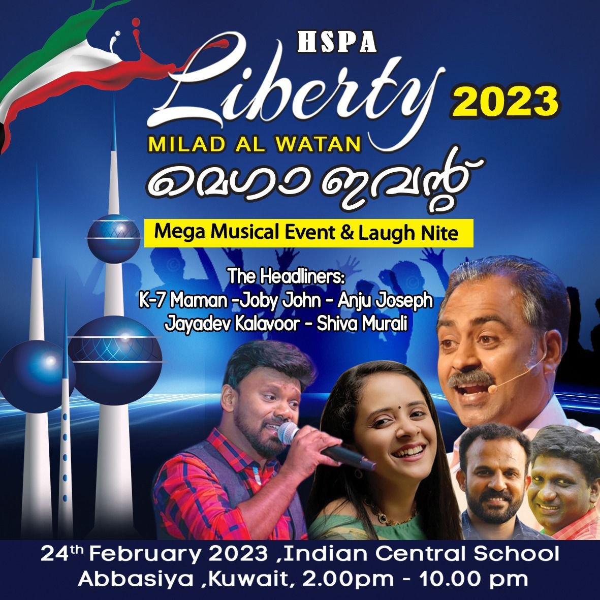 ഹൃദയസ്പർശ്ശം പ്രവാസി അസോസിയേഷൻ (എച്ച്.എസ്.പി.എ) സംഘടിപ്പിക്കുന്ന ഹാലാ ഫെബ്രുവരി ആഘോഷരാവ് “ലിബർട്ടി-2023, മീലാദ് അൽ വത്തൻ” മെഗാ ഷോ ഫെബ്രുവരി 24നു അബ്ബാസിയ ഇന്ത്യൻ സെന്റ്രൽ സ്കൂളിൽ ഉച്ചക്ക് 2:00 മണിക്ക് ആരംഭിക്കും..