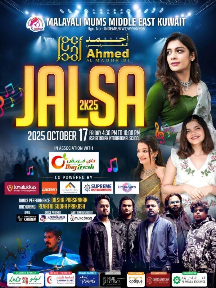 കുവൈറ്റ് സിറ്റി : കുവൈറ്റിലെ വനിതാ സംസ്കാരിക സംഘടനയായ മലയാളി മാംസ് മിഡിൽ ഈസ്റ്റ് (MMME) കുവൈറ്റ് എട്ടാം വാർഷികാഘോഷത്തിന്റെ ഭാഗമായി സംഘടിപ്പിക്കുന്ന ജൽസ 2025 മെഗാ പരിപാടി ഒക്ടോബർ 17 വെള്ളി വൈകിട്ട് നാല് മണി മുതൽ അബ്ബാസിയ ആസ്പയർ ഇന്ത്യൻ ഇന്റർനാഷണൽ സ്കൂളിൽ നടക്കും.