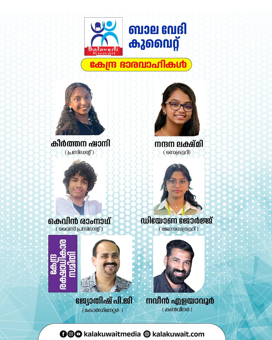 കുവൈറ്റ് സിറ്റി: മലയാളി വിദ്യാർത്ഥികളുടെ സർഗ്ഗ വേദിയായ ബാലവേദി കുവൈറ്റിന്റെ പുതിയ ഭാരവാഹികളെ തിരഞ്ഞെടുത്തു. ബാലവേദി രക്ഷധികാരി സമിതി കോർഡിനേറ്റർ ശങ്കർറാമിന്റെ അധ്യക്ഷതയിൽ നടന്ന യോഗത്തിൽ ബാലവേദി കുവൈറ്റിന് പുതിയ ഭാരവാഹികളെ തിരഞ്ഞെടുത്തു. നാലു മേഖലകളിൽ നിന്നുമായി നാല് മേഖലാ രക്ഷധികാരി സമിതി അംഗങ്ങളും കേന്ദ്ര രക്ഷധികാരി സമിതി അംഗങ്ങളും ബാലവേദിയുടെ നാല് മേഖലാ കമ്മിറ്റികൾ ഉൾപ്പടെ നൂറിൽ പരം പ്രതിനിധികൾ പങ്കെടുത്ത യോഗത്തിൽ ബാലവേദി രക്ഷധികാരിസമിതി കൺവീനർ രജീഷ് സി സ്വാഗതം പറഞ്ഞു. ബാലവേദി കുവൈറ്റ് സെക്രട്ടറി അഞ്ജലിറ്റ രമേഷ് വാർഷിക റിപ്പോർട്ട് അവതരിപ്പിച്ചു. കലകുവൈറ്റ് ജനറൽ സെക്രട്ടറി ജിതിൻ പ്രകാശ് പുതിയ ഭാരവാഹികളെ സംബന്ധിച്ച നിർദ്ദേശം അവതരിപ്പിച്ചു. പ്രസിഡന്റായി കീർത്തന ഷാനി, സെക്രട്ടറിയായി നന്ദന ലക്ഷ്മി, വൈസ് പ്രസിഡന്റായി കെവിൻ രാംനാഥ്, ജോയിന്റ് സെക്രട്ടറിയായി ഡിയോണ ജോർജ്ജ് എന്നിവർ തിരഞ്ഞെടുക്കപെട്ടു. നവീൻ എളയാവൂർ കൺവീനറായും, ജ്യോതിഷ് പി.ജി കോഡിനേറ്ററുമായി പുതിയ കേന്ദ്ര രക്ഷാധികാരി സമിതിയും നിലവിൽ വന്നു. പുതിയതായി തിരഞ്ഞെടുത്ത ബാലവേദി സെക്രട്ടറി നന്ദന ലക്ഷ്മി നന്ദി പറഞ്ഞു.