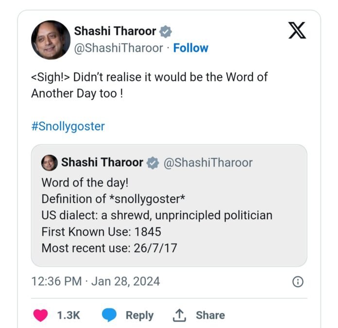 2017ൽ ബിഹാറിലെ മഹാസഖ്യം വിട്ട് കുമാർ ബിജെപിയിൽ ചേർന്നിരുന്നു.അന്ന് തരൂർ ട്വീറ്റ് ചെയ്ത വാക്കാണ് സ്നോലിഗോസ്റ്റർ എന്നത്. “ഇത് മറ്റൊരു ദിവസത്തിൻ്റെ വാക്കായിരിക്കുമെന്ന് അറിഞ്ഞിരുന്നില്ല! എന്ന് പറഞ്ഞാണ് തരൂർ വീണ്ടും പോസ്റ്റ് ഷെയർ ചെയ്തത്.