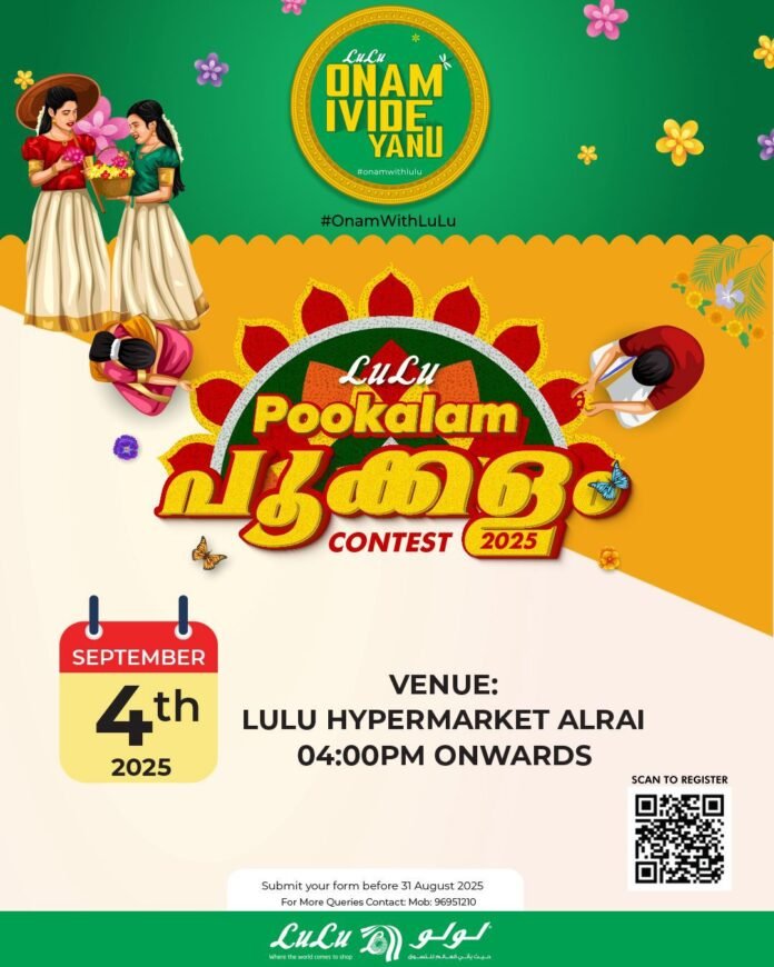 കുവൈറ്റ് സിറ്റി : ഓണാഘോഷത്തോടനുബന്ധിച്ച് കുവൈറ്റിലെ ലുലുവിൽ ‘ ഓണം ഇവിടെയാണ്’ സംഘടിപ്പിക്കുന്നു. സെപ്റ്റംബർ നാലിന് ആരംഭിക്കുന്ന ഓണാഘോഷ പരിപാടികളിൽ വിവിധതരത്തിലുള്ള മത്സരങ്ങളും ഉണ്ടാകും. ലുലു ഹൈപ്പർ മാർക്കറ്റിലെ അൽ റായ് ഔട്ട്ലെറ്റിൽ ആണ് മത്സരങ്ങൾ സംഘടിപ്പിക്കുക. വൈകിട്ട് നാലുമണിക്ക് തുടങ്ങുന്ന ആഘോഷ പരിപാടികളിൽ പായസം മത്സരം, ഓണം സൂപ്പർ സിംഗേഴ്സ് മത്സരം, പൂക്കള മത്സരം എന്നിവ നടക്കും.