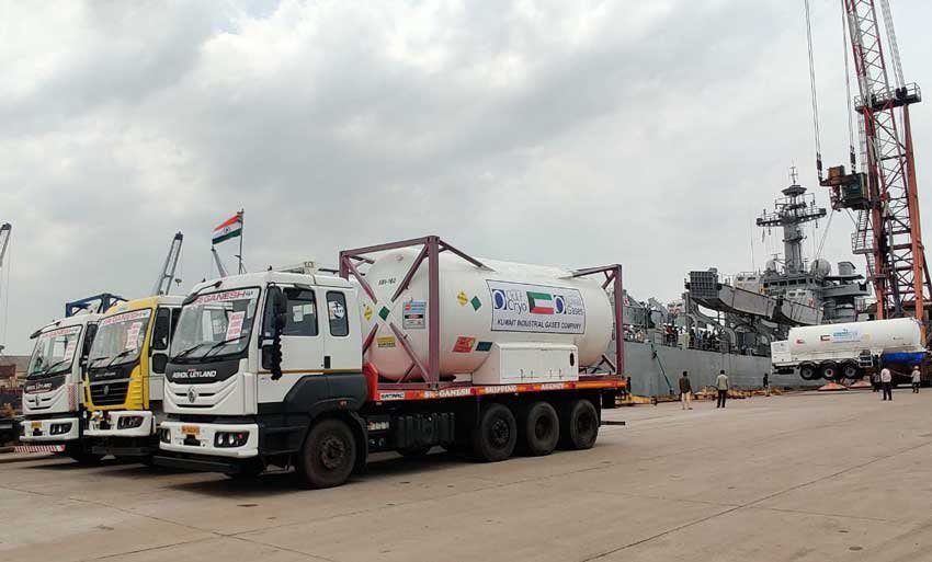 കുവൈത്ത്/ മംഗലാപുരം: കുവൈത്തിൽ നിന്ന് ഇന്ത്യയിലേക്ക് അയച്ച ഓക്സിജൻ അടക്കമുള്ള മെഡിക്കൽ സാമഗ്രികൾ വഹിച്ചുകൊണ്ടുള്ള നാവികസേനാ കപ്പലായ ഐഎൻഎസ് ഷാർദുൽ ഇന്ന് ന്യൂ മംഗലാപുരം പോർട്ട് ട്രസ്റ്റിൽ (എൻഎംപിടി) എത്തി. 11 ലിക്വിഡ് ഓക്സിജൻ ടാങ്കറുകളും , രണ്ട് സെമി ട്രെയിലറുകളും 1,200 ഓക്സിജൻ സിലിണ്ടറുകളും ആണ് മംഗലാപുരത്ത് എത്തിയത്.