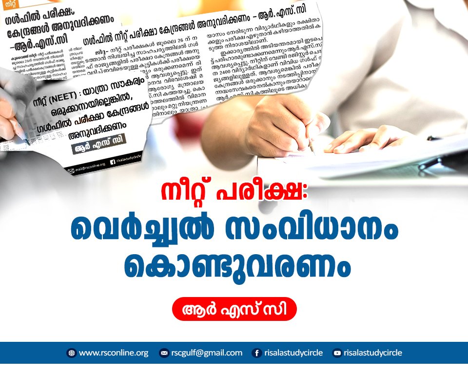 കുവൈത്ത് സിറ്റി : നീറ്റ് പരീക്ഷകള്ക്ക് കുവൈത്ത്, ദുബൈ എന്നിവിടങ്ങളില് കേന്ദ്രങ്ങള് അനുവദിച്ച കേന്ദ്ര സര്ക്കാര് തീരുമാനത്തെ രിസാല സ്റ്റഡി സര്ക്കിള് സ്വാഗതം ചെയ്തു. ഇത് സംബന്ധിച്ച് 2020 ജൂണില് കേന്ദ്ര മാനവ വിഭവശേഷി മന്ത്രാലയത്തിന് ആര് എസ് സി കത്തയച്ചിരുന്നു. അതോടൊപ്പം ഇത്തരം പരീക്ഷകള്ക്ക് വെര്ച്ച്വല് സംവിധാനം കൊണ്ടുവരണമെന്ന് ആര് എസ് സി ആവശ്യപ്പെട്ടു.