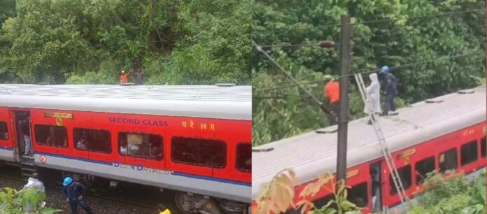 ജാം നഗർ-തിരുനെല്ലി എക്സ്പ്രസ് ട്രെയിനിന് മുകളിലേക്കാണ് മരം വീണത്. സംഭവത്തെ തുടർന്ന് മണിക്കൂറുകളോളം ട്രയിൻ സർവീസ് നിർത്തി വെക്കേണ്ടി വന്നു. മരം പൂർണ്ണമായി മുറിച്ച് മാറ്റിയശേഷമാണ് ഗതാഗതം പുനരാരംഭിച്ചത്. ഇന്നലെ ഈ പ്രദേശത്തും സമീപസ്ഥലങ്ങളിലും ശക്തമായ മഴയും കാറ്റും ഉണ്ടായിരുന്നു.