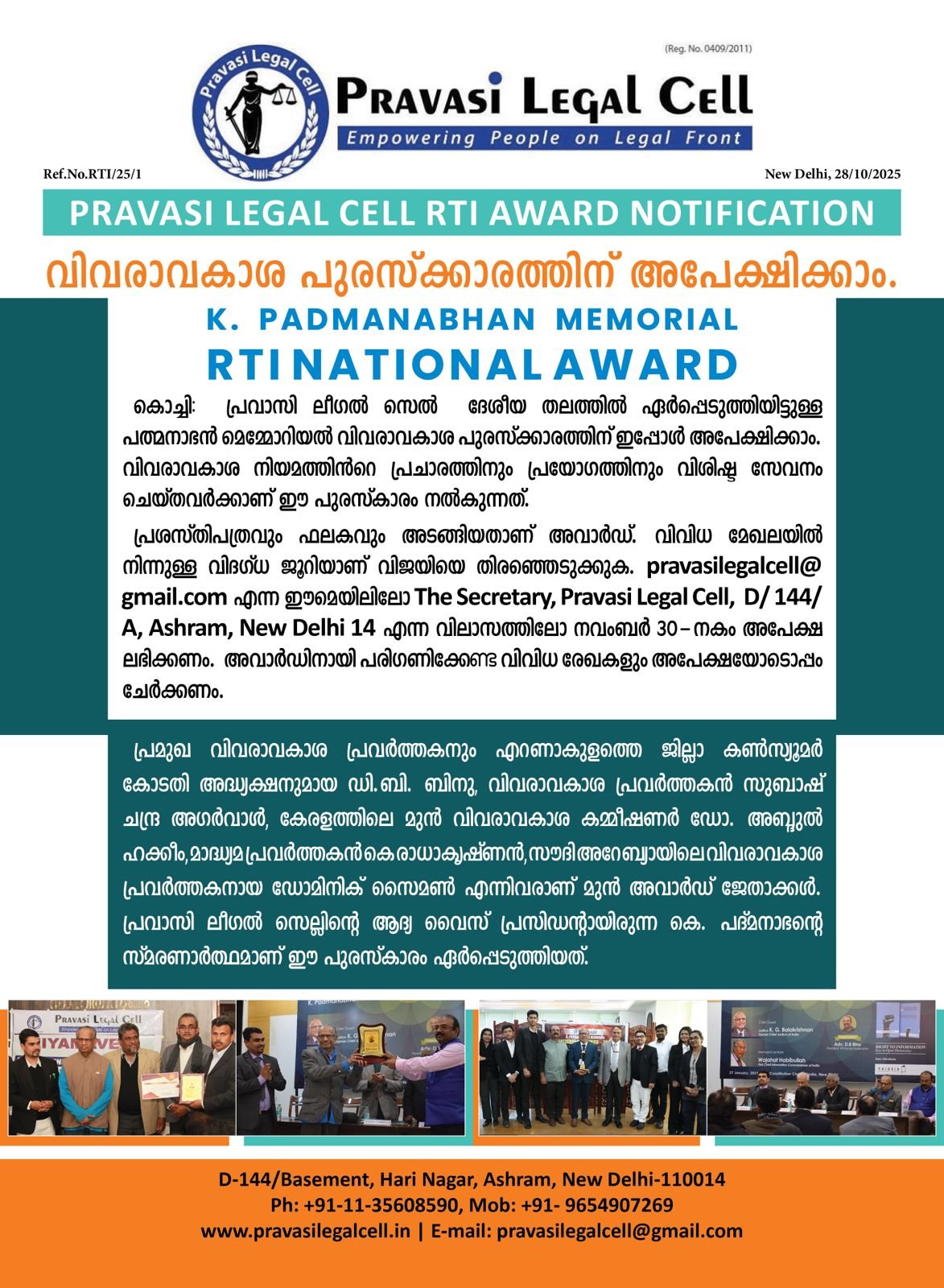 കൊച്ചി : പ്രവാസി ലീഗൽ സെൽ ദേശീയ തലത്തിൽ ഏർപ്പെടുത്തിയിട്ടുള്ള പത്മനാഭൻ മെമ്മോറിയൽ വിവരാവകാശ പുരസ്ക്കാരത്തിന് ഇപ്പോൾ അപേക്ഷിക്കാം. വിവരാവകാശ നിയമത്തിൻറെ പ്രചാരത്തിനും പ്രയോഗത്തിനും വിശിഷ്ട സേവനം ചെയ്തവർക്കാണ് ഈ പുരസ്കാരം നൽകുന്നത്.