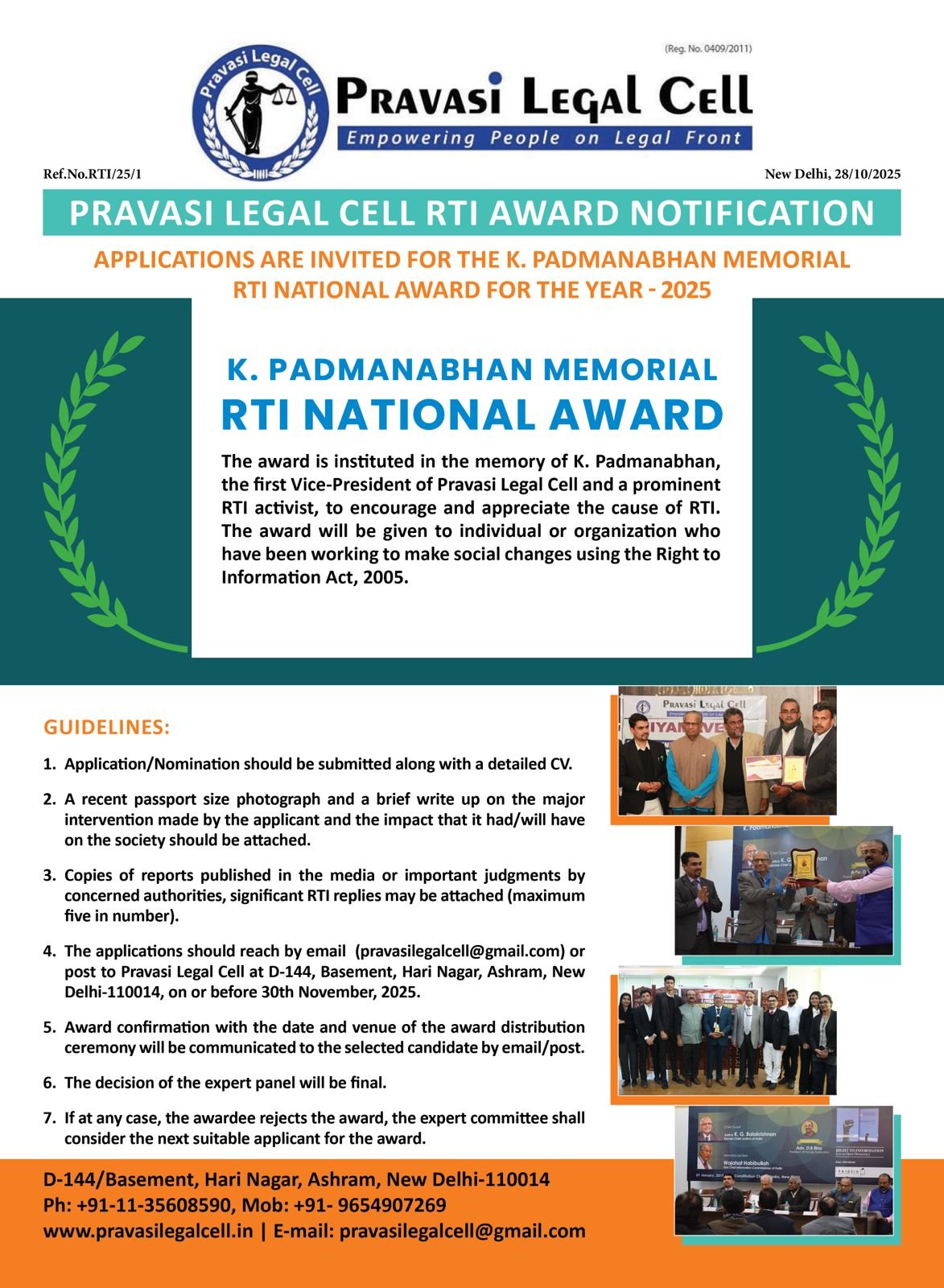 കൊച്ചി : പ്രവാസി ലീഗൽ സെൽ ദേശീയ തലത്തിൽ ഏർപ്പെടുത്തിയിട്ടുള്ള പത്മനാഭൻ മെമ്മോറിയൽ വിവരാവകാശ പുരസ്ക്കാരത്തിന് ഇപ്പോൾ അപേക്ഷിക്കാം. വിവരാവകാശ നിയമത്തിൻറെ പ്രചാരത്തിനും പ്രയോഗത്തിനും വിശിഷ്ട സേവനം ചെയ്തവർക്കാണ് ഈ പുരസ്കാരം നൽകുന്നത്.